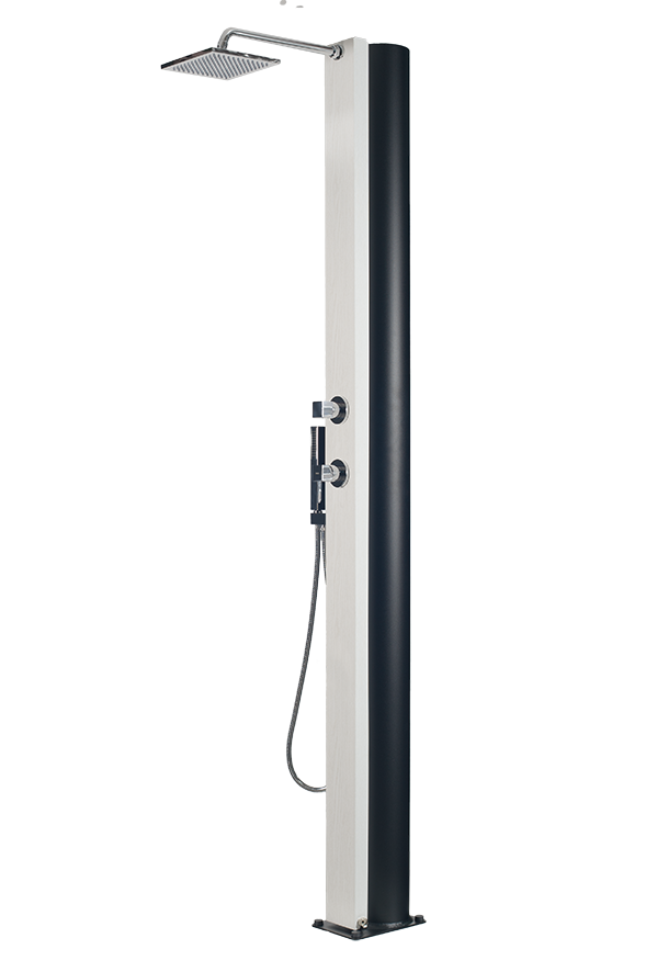 Hliníková solární sprcha o objemu 40 litrů. Přední část je vyrobena z pozinkované oceli s povrchovou úpravou dřeva - bilý dub a šířkou 112 mm. Obsahuje jednopákovou baterii s obdélníkovým designem z pochromované mosazi. Rozměr sprchové hlavice je 200 x 200 mm. Tento model je bez oplachu nohou.