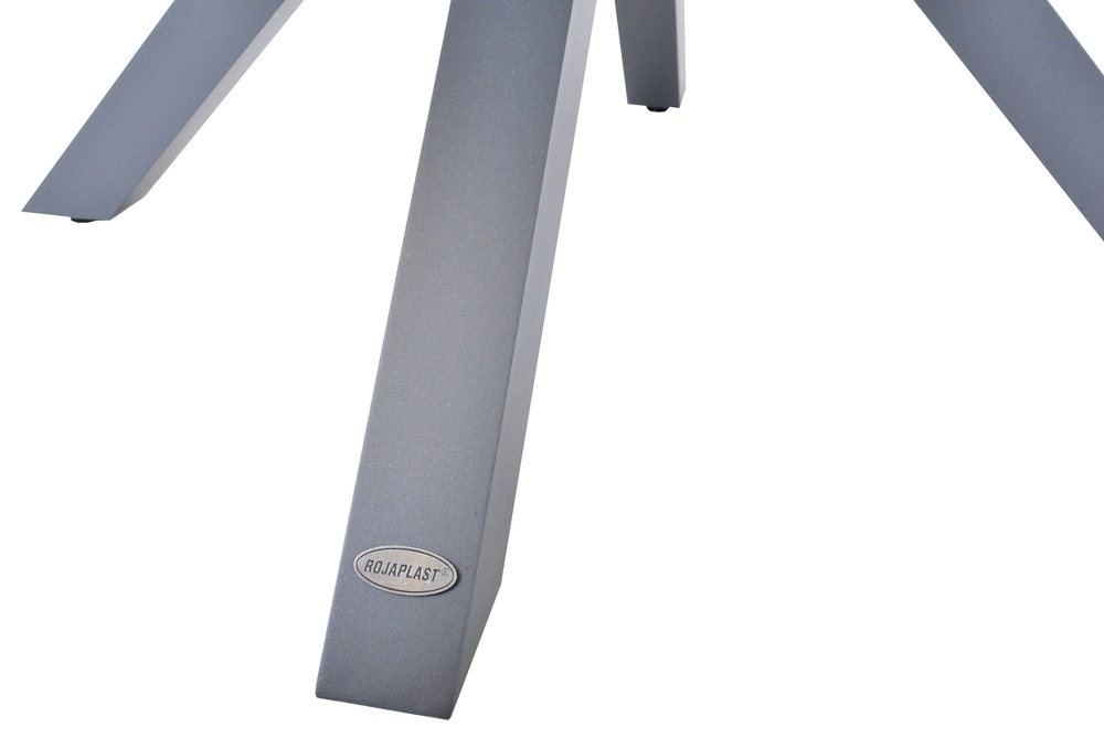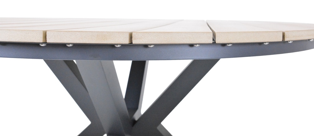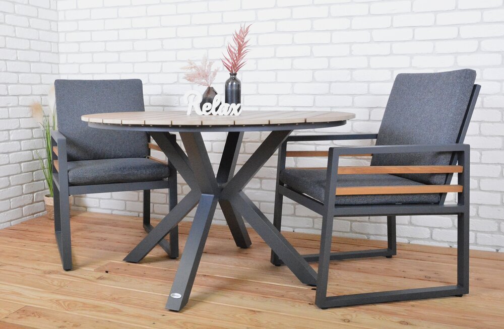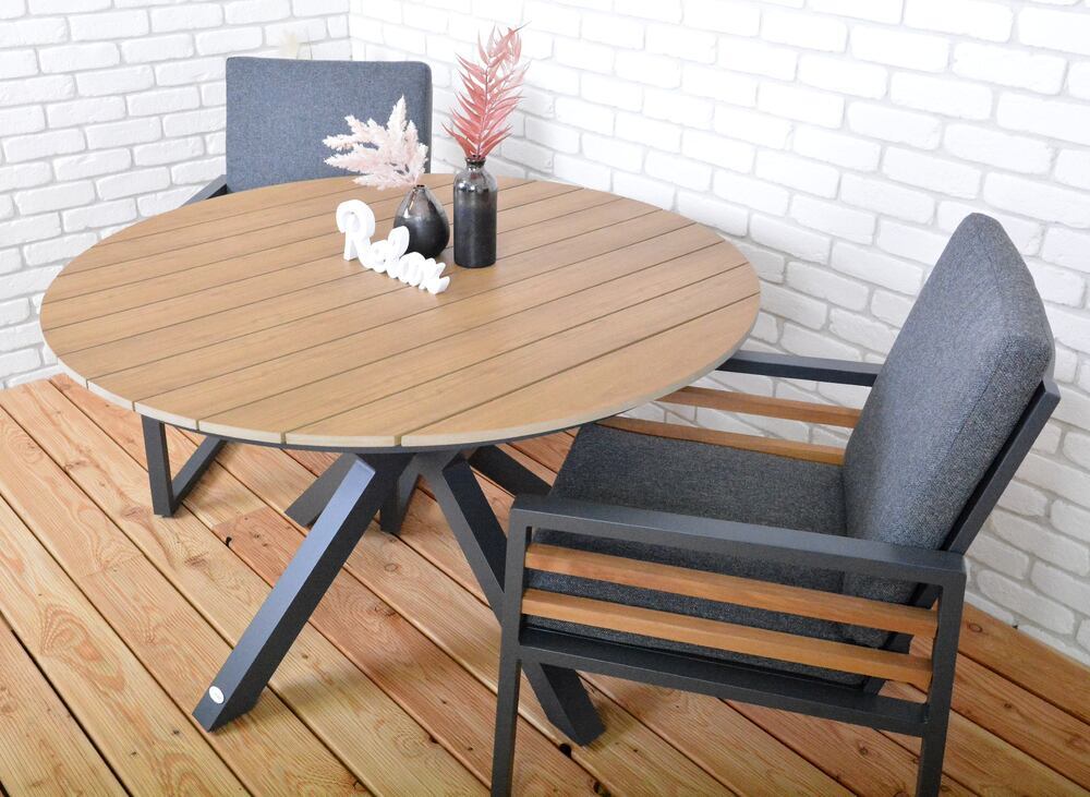 Luxusní hliníkový stůl v grafitovém provedení, doplněný o dřevěnou stolovou desku z polywoodu.
