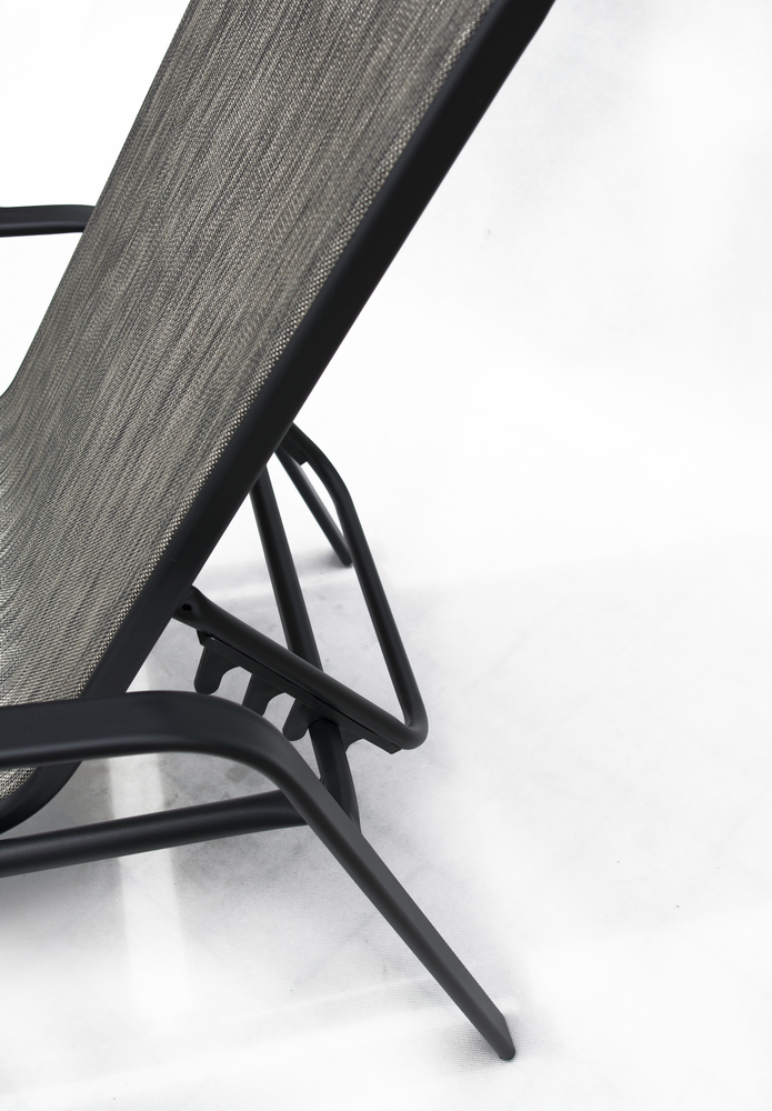Elegantní polohovací lehátko se stabilní kovovou kostrou. Sedák a opěrná plocha je z textilie.
