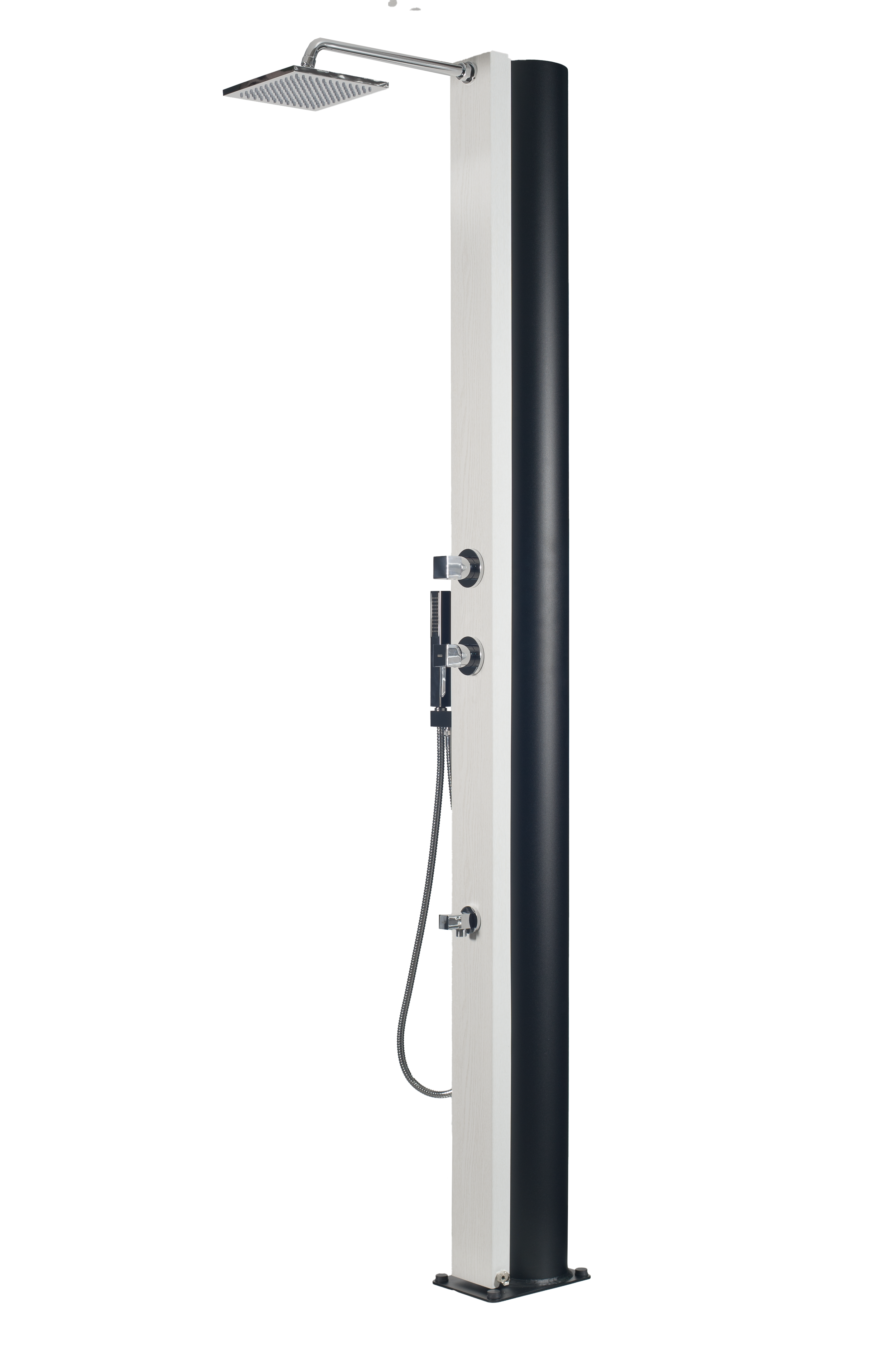 Hliníková solární sprcha o objemu 40 litrů. Přední část je vyrobena z pozinkované oceli s povrchovou úpravou dřeva - bilý dub a šířkou 112 mm. Obsahuje jednopákovou baterii s obdélníkovým designem z pochromované mosazi. Rozměr sprchové hlavice je 200 x 200 mm. Tento model je vybaven sprchou pro oplach nohou.