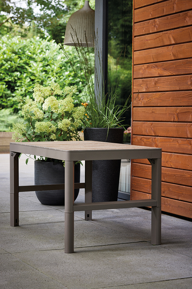 Stůl je vyroben z pevného plastu, který zaručuje dlouhou životnost a bezúdržbové používání. Boční strany v imitaci rattanu dodávají stolu moderní vzhled, zatímco stolová deska s dekorem dřeva v barvě ashwood působí elegantně a nadčasově.