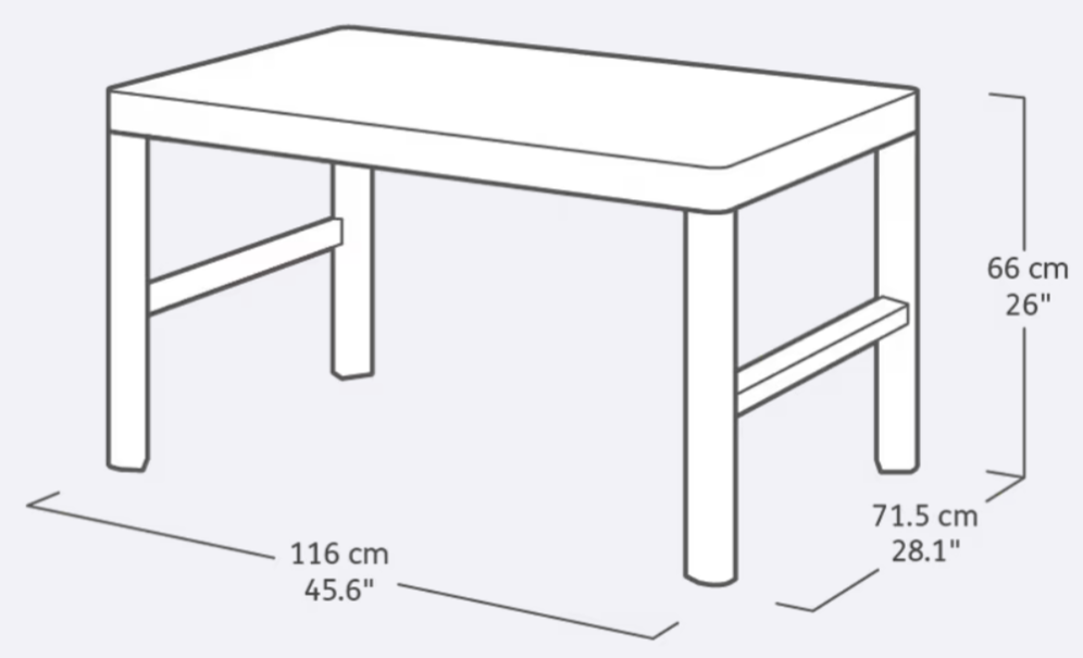 Stůl je vyroben z pevného plastu, který zaručuje dlouhou životnost a bezúdržbové používání. Boční strany v imitaci rattanu dodávají stolu moderní vzhled, zatímco stolová deska s dekorem dřeva v barvě ashwood působí elegantně a nadčasově.