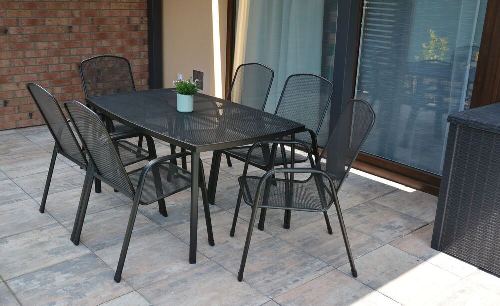 Je lehce udržovatelný a omyvatelný. Uprostřed stolu je otvor pro slunečník.