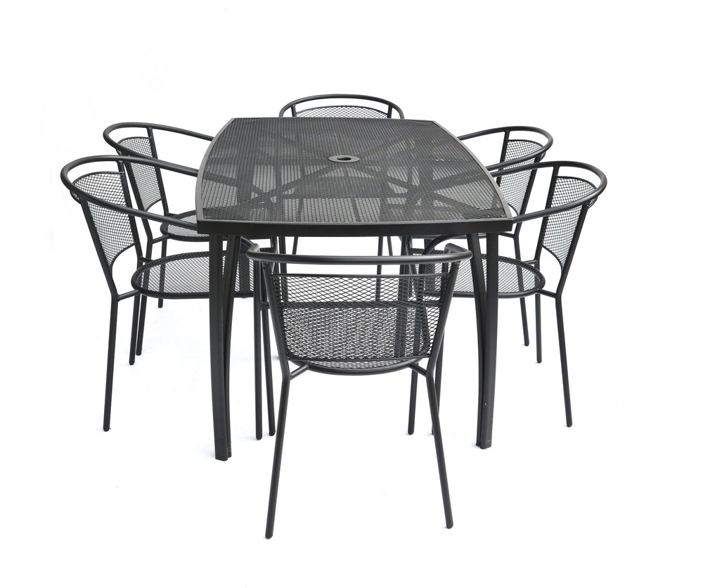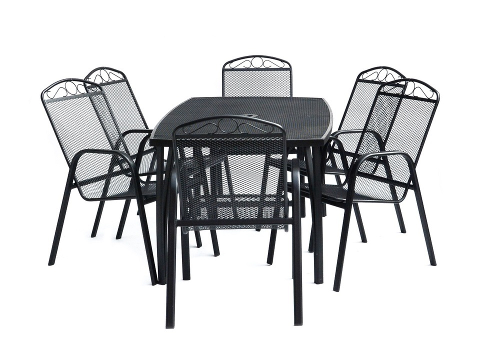 Kovový zahradní stůl s drátěnou vrchní deskou obdélníkového tvaru.