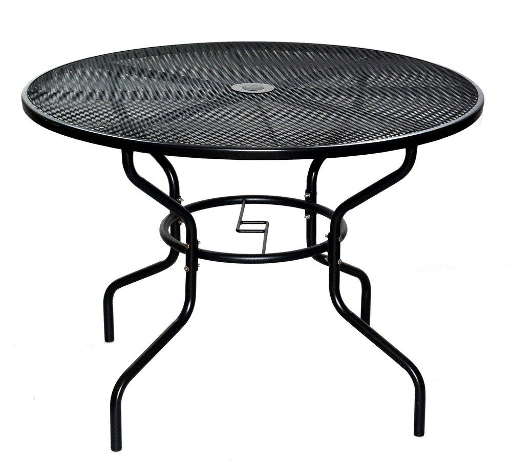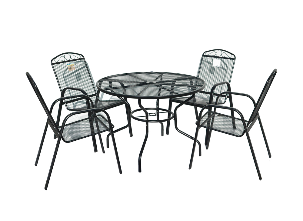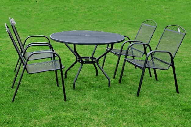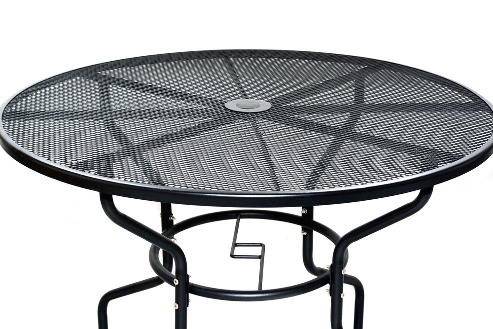 Kulatý, kovový, zahradní stůl s drátěnou vrchní deskou.