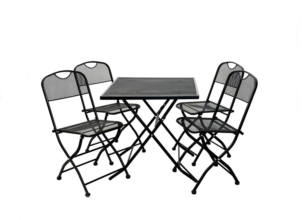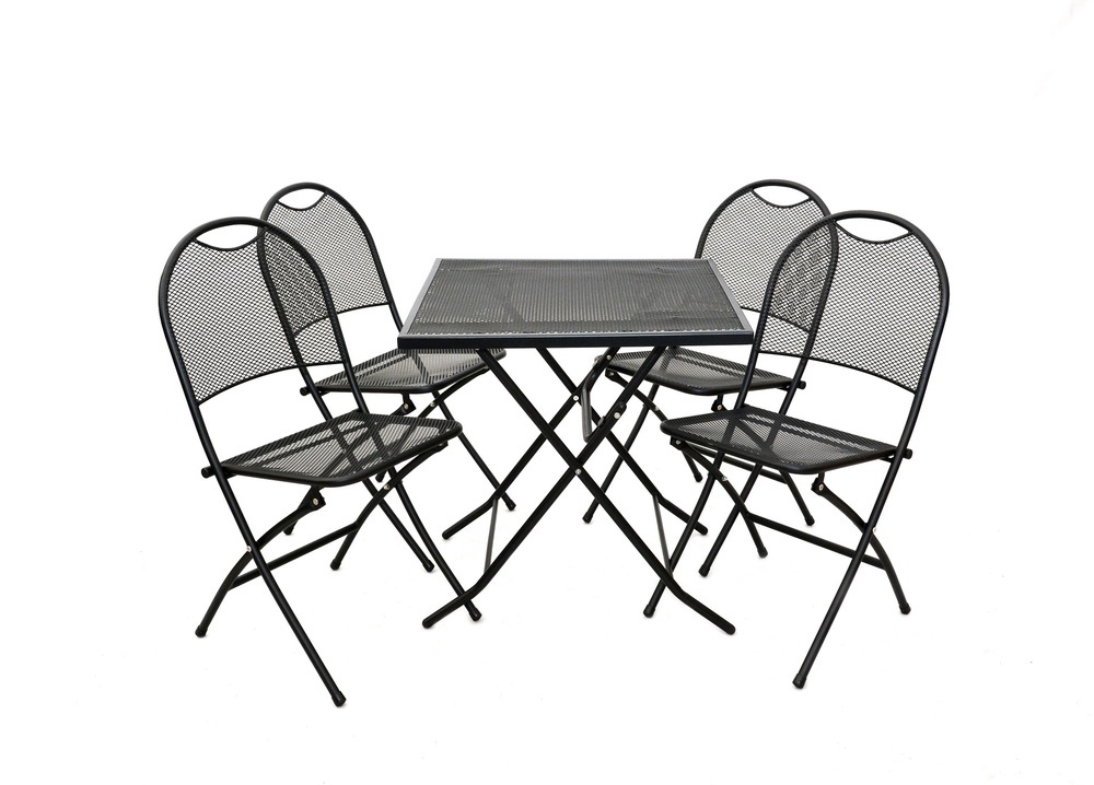 Skládací kovový zahradní stůl s drátěnou vrchní deskou.