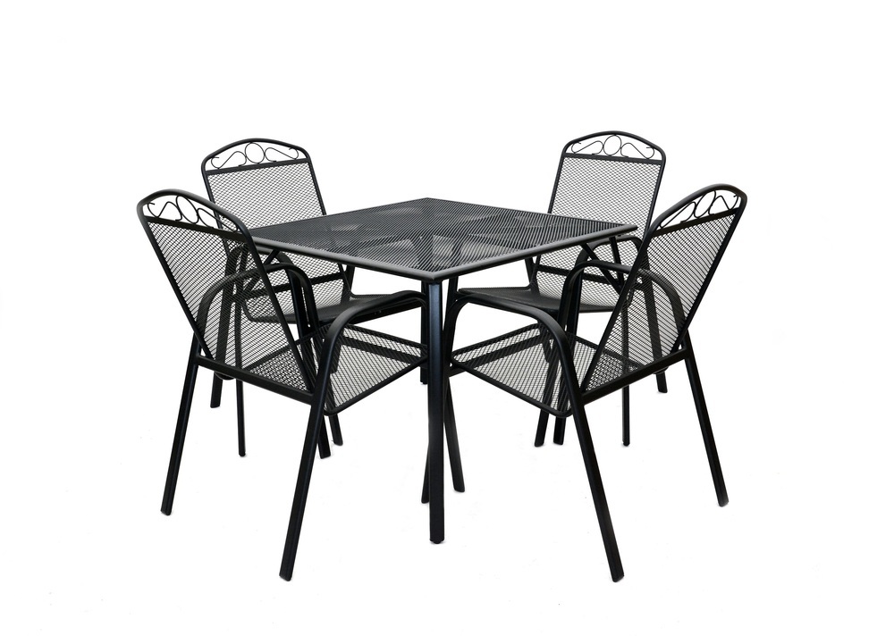 Kovový zahradní stůl s drátěnou vrchní deskou čtvercového tvaru.