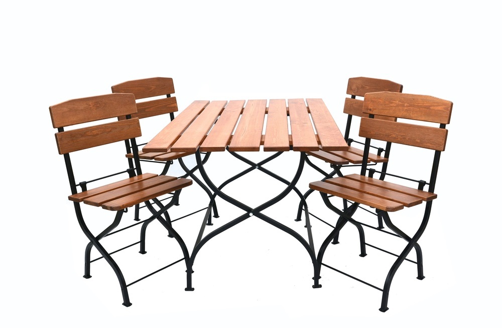 Zahradní křeslo dřevěné s kovovou podnoží. Barva dřeva je hnědá.