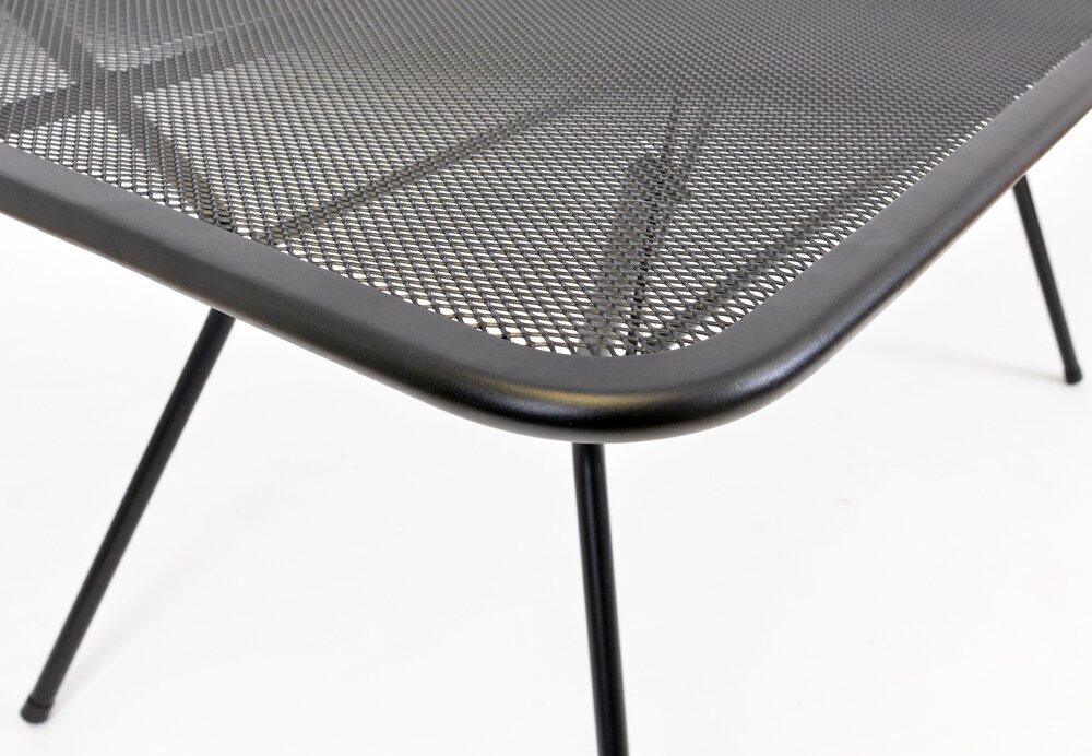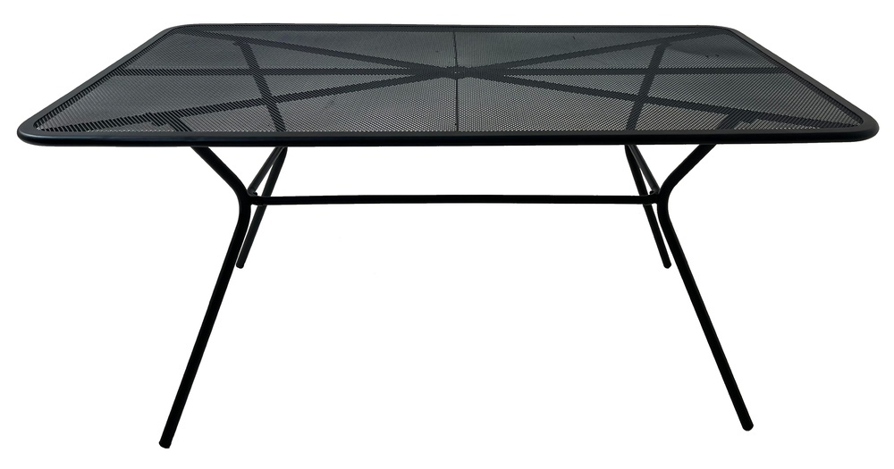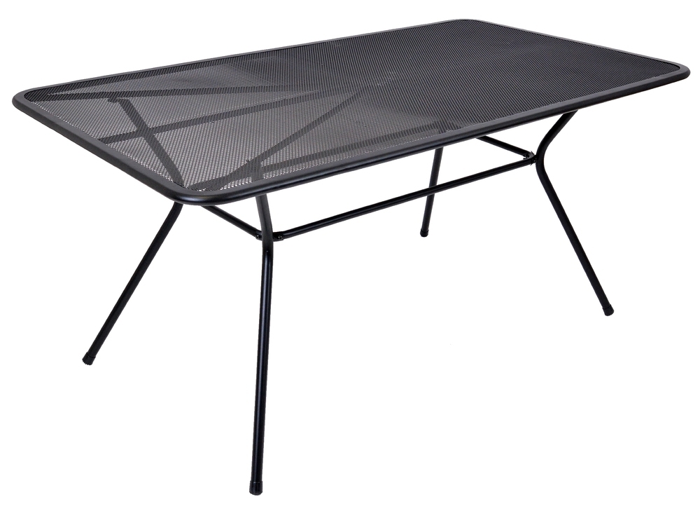 Kovový zahradní stůl s drátěnou vrchní deskou obdélníkového tvaru.