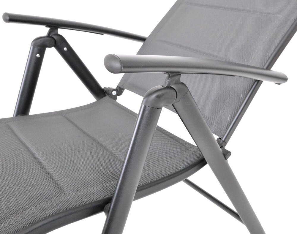 Křeslo je vybaveno kvalitní textilií 2×1 s výplní z rychleschnoucí pěny, která zajišťuje výjimečný komfort i při delším sezení. Díky polohovatelnému opěradlu si snadno nastavíte ideální pozici pro relaxaci – ať už při čtení, slunění nebo odpočinku. Křeslo nabízí až sedm různých poloh opěrky.